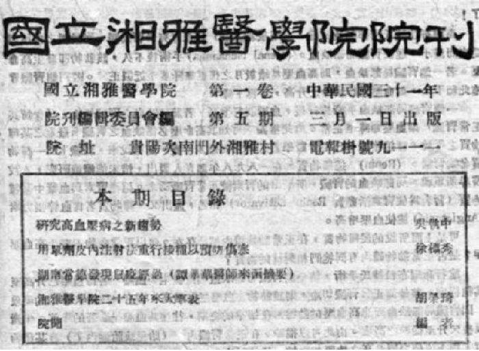 1942年3月1日《國(guó)立湘雅醫(yī)學(xué)院院刊》第一卷第五期封面;第三條為“湖南常德發(fā)現(xiàn)鼠疫經(jīng)過(guò)(譚學(xué)華醫(yī)師來(lái)函摘要)”