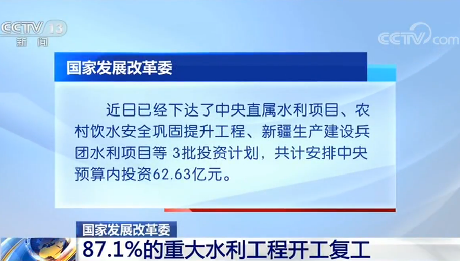 國家發(fā)展改革委近日已經(jīng)下達了中央直屬水利項目、農(nóng)村飲水安全鞏固提升工程、新疆生產(chǎn)建設(shè)兵團水利項目等3批投資計劃,共計安排中央預(yù)算內(nèi)投資62.63億元。