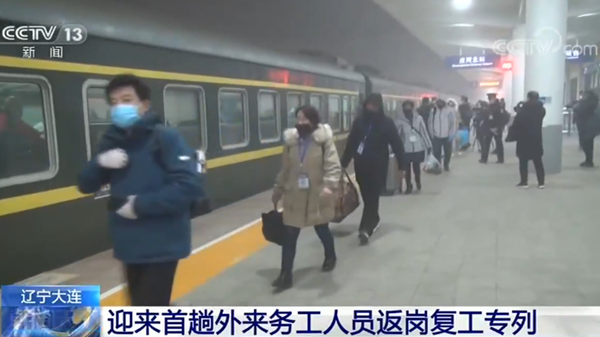 29日凌晨1時05分,由黑龍江省訥河開往遼寧大連莊河的K4082次務工人員返崗復工專列順利到達莊河北站。這是遼寧大連迎來的首趟外來務工人員返崗復工專列,521名務工人員分別來自黑龍江訥河、齊齊哈爾等列沿線的兩省六市。