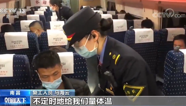 復工人員 馬海云:這一趟列車是(政府)給我們免費提供的,沒有掏一毛錢的票錢,然后列車不定時地在里面消毒,不定時地給我們量體溫,衛生環境也很好,搞得很干凈。