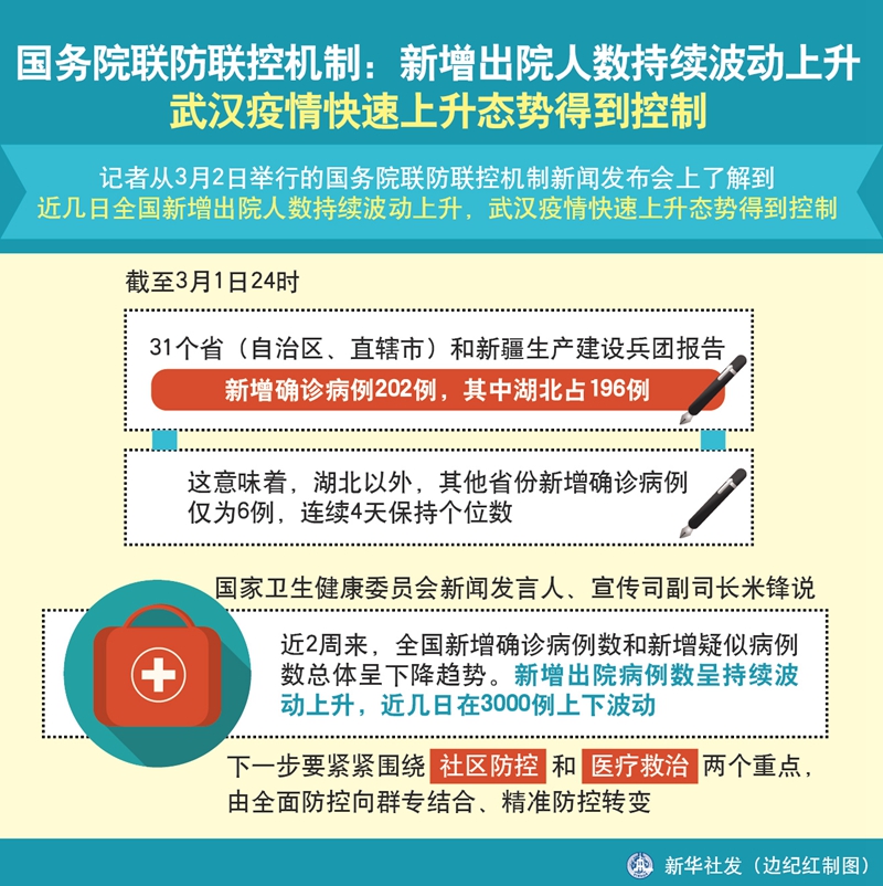 ? 新華社北京3月2日電(記者屈婷、周瑋)記者從2日舉行的國務院聯防聯控機制新聞發布會上了解到,近幾日全國新增出院人數持續波動上升,武漢疫情快速上升態勢得到控制。