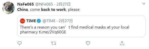 推特用戶NaFe065說:中國趕緊復工復產吧,拜托了。