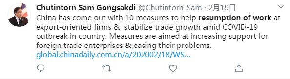 推特用戶Chutintorn Sam Gongsakdi說:在應對新冠肺炎疫情期間,中國出臺了10項措施來幫助出口企業復工復產,并推動貿易的穩定增長。這些措施旨在加強對外貿企業的支持,并解決它們面臨的問題。