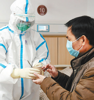 2月18日,在江西中醫藥大學附屬醫院撫生院區新冠肺炎患者的隔離病房內,護士將中藥湯劑端給患者。時 雨攝(影像中國)