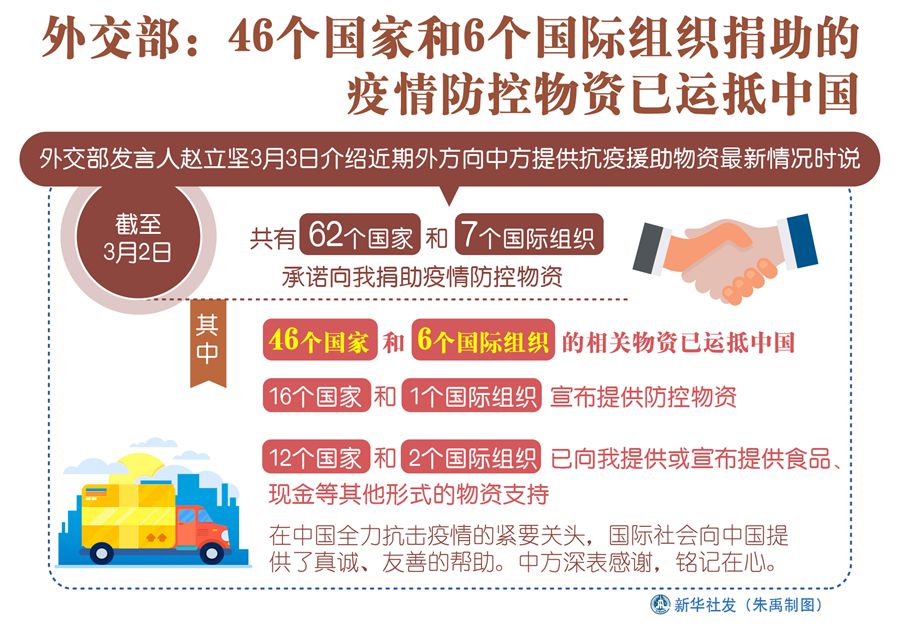 新華社北京3月3日電(記者朱超)外交部發(fā)言人趙立堅(jiān)3日介紹近期外方向中方提供抗疫援助物資最新情況時(shí)說(shuō),截至3月2日,共有46個(gè)國(guó)家和6個(gè)國(guó)際組織的相關(guān)物資已運(yùn)抵中國(guó),中方深表感謝,銘記在心。