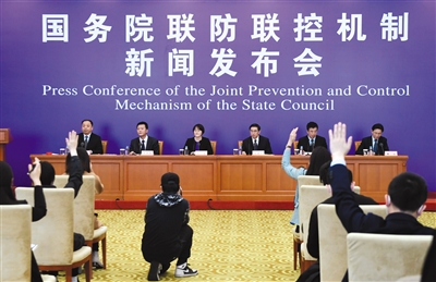 3月7日,國務院聯防聯控機制新聞發布會現場,介紹農民工返崗復工服務保障工作部署。新京報記者 吳寧 攝