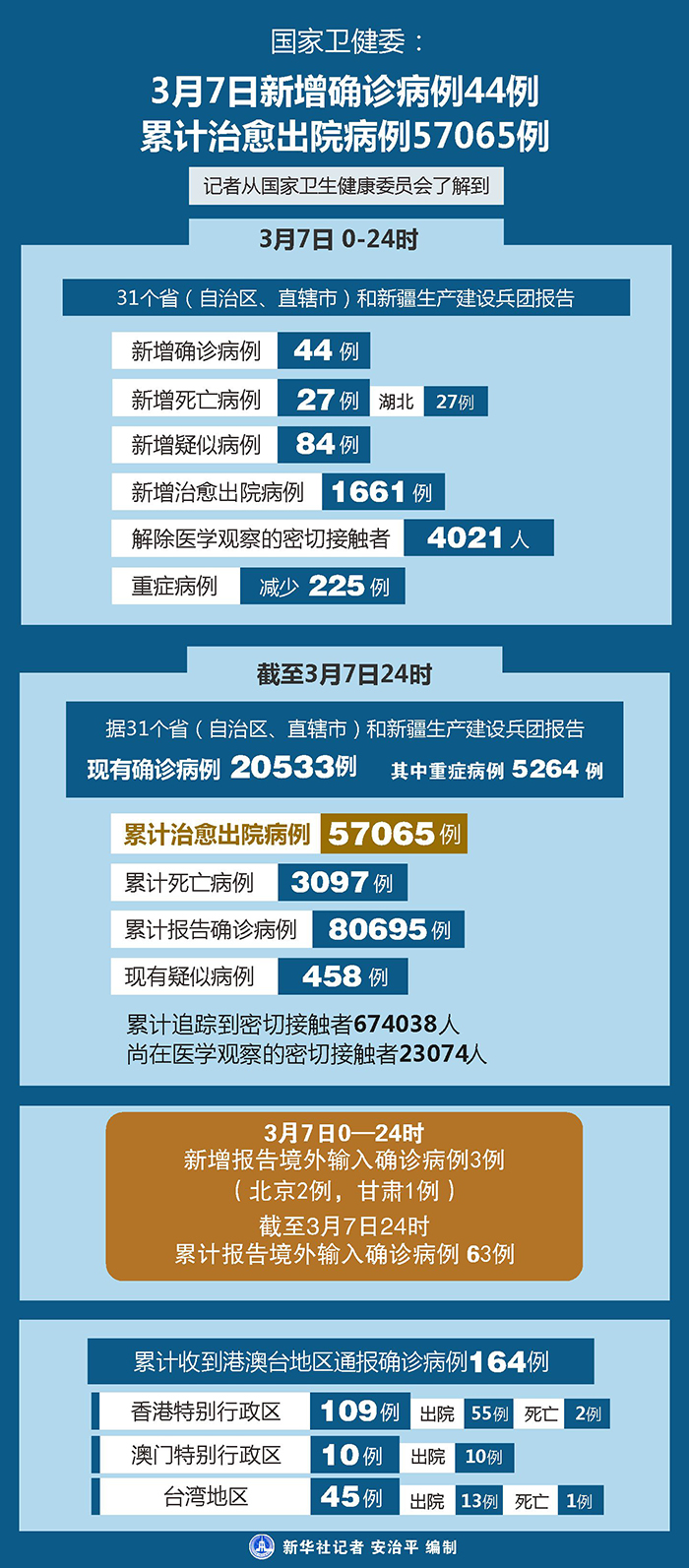 新華社北京3月8日電(記者陳煒偉、陳聰)記者8日從國家衛生健康委員會了解到,3月7日0—24時,31個省(自治區、直轄市)和新疆生產建設兵團報告新增確診病例44例,新增死亡病例27例(湖北27例),新增疑似病例84例。