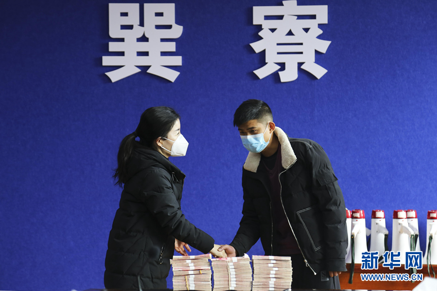 1月28日,90后退役軍人蘇培賓(右)向廣東惠東巽寮管委會捐款30萬元助力家鄉疫情防控。 新華社發