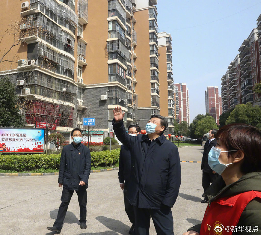 正在武漢考察的習近平總書記來到東湖新城社區,察看社區衛生防疫、社區服務、群眾生活保障等情況。樓上居家隔離的居民群眾看到總書記來了,紛紛從陽臺和窗戶探出頭來,揮手向總書記問好,有的搖著國旗高呼:“中國加油!武漢加油!”習近平不時駐足,微笑著向大家揮手致意:“大家一起加油,再堅持一下!”(文字:張曉松、朱基釵 攝影:鞠鵬,謝環馳)