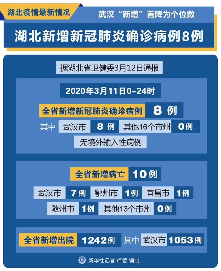 新華社武漢3月12日電(記者廖君、馮國棟)據湖北省衛健委12日通報,2020年3月11日0—24時,全省新增新冠肺炎確診病例8例,其中:武漢市8例,其他16個市州均為0例。無境外輸入性病例。