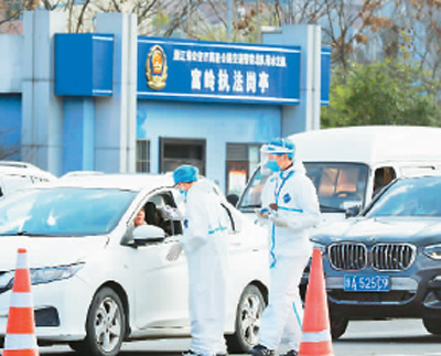 醫(yī)護(hù)人員在浙江省麗水市麗龍高速公路富嶺收費(fèi)站出口為來往人員測(cè)體溫。陳英亞攝
