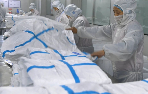 1月27日,安徽省六安市裕安區一家醫療科技有限公司的工人在加工防護服。新華社發(陳力 攝)