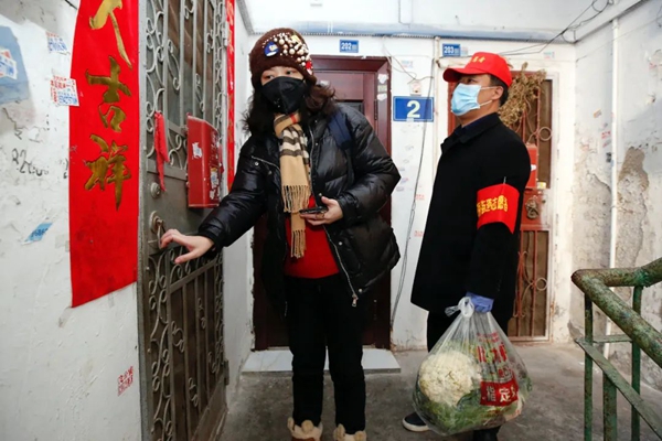 武漢市江岸區花橋社區志愿者蔣晨一(左)和下沉社區的干部謝文先來到一名獨居老人家為其送菜(2月20日攝)。新華社記者沈伯韓攝