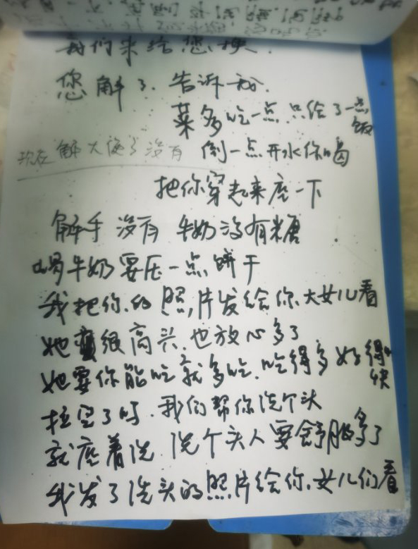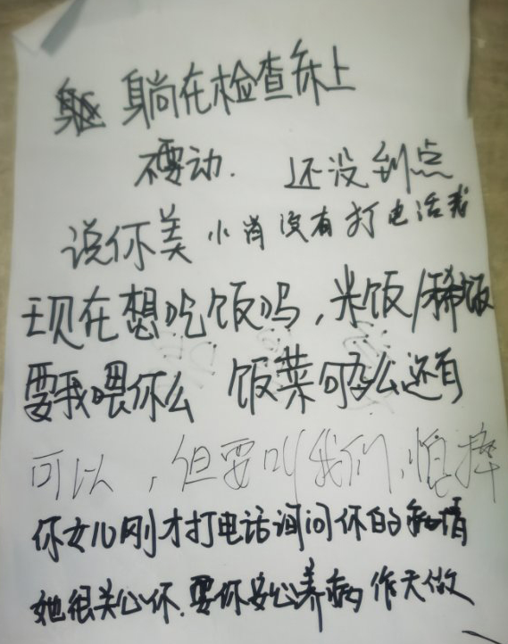 家人打來電話時,她聽不清家人的話,我的同事們就將那些話寫在紙上給她,“我把你的照片發給你的大女兒看,她很高興,也放心多了。她要你能吃就多吃,吃得多,好得快。”
