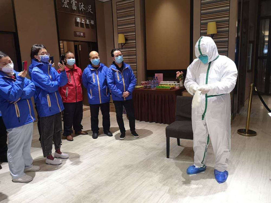 圖為四川大學華西醫院援湖北醫療隊朱仕超在教同事們穿防護服。
