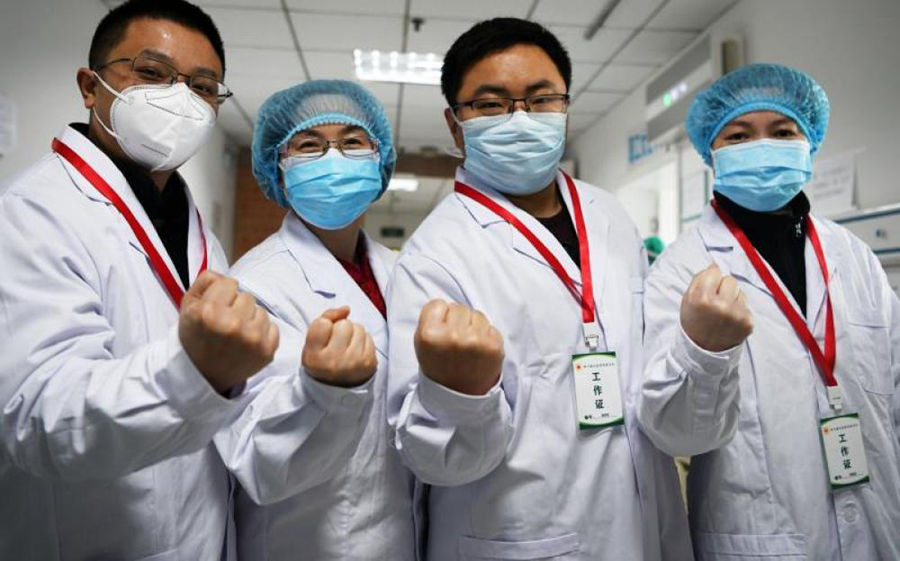 圖為四川大學華西醫院援湖北醫療隊朱仕超(右二)與同事相互鼓勵打氣。