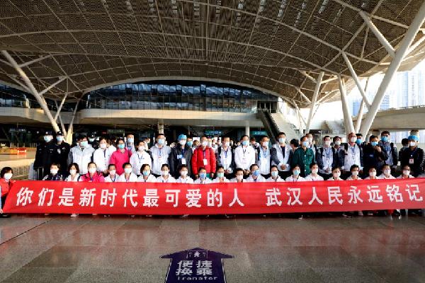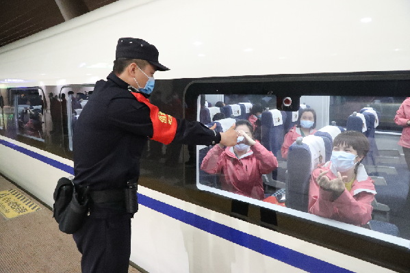 隨著疫情防控形勢逐步轉好,完成救助任務的各地馳援醫療隊將分批有序撤離。當日,來自貴州、湖南、河南三省的484名援鄂醫護人員分8批次,分別乘坐5趟高鐵踏上回家的路程,在武漢火車站,鐵路民警、車站工作人員和志愿者們在進站口、候車室、站臺上歡送這群最美麗的“白衣天使”。