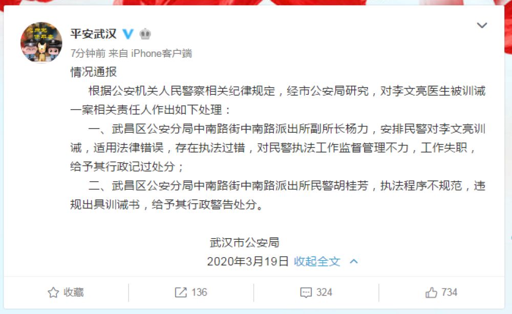 根據(jù)公安機(jī)關(guān)人民警察相關(guān)紀(jì)律規(guī)定,經(jīng)市公安局研究,對(duì)李文亮醫(yī)生被訓(xùn)誡一案相關(guān)責(zé)任人作出如下處理: