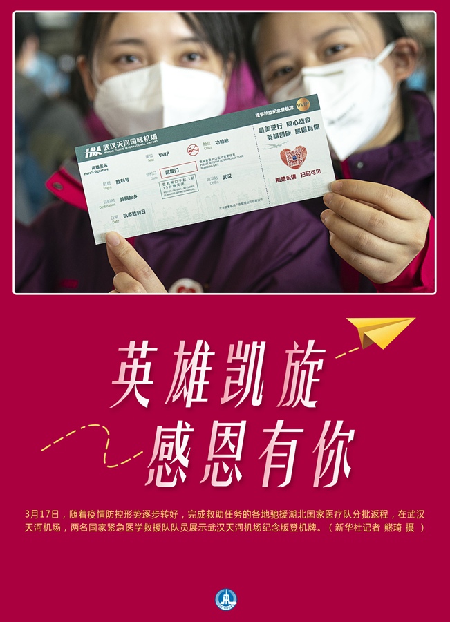 登機口是“凱旋門”,航班號是“勝利號”,艙位是“功勛艙”,旅客姓名是英雄簽名,一張精心制作的援鄂抗疫登機紀念牌,成為援鄂醫療隊員們“最美的紀念”。