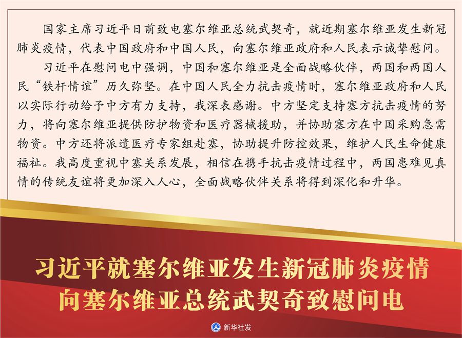 習(xí)近平在慰問電中強(qiáng)調(diào),中國和塞爾維亞是全面戰(zhàn)略伙伴,兩國和兩國人民“鐵桿情誼”歷久彌堅(jiān)。在中國人民全力抗擊疫情時,塞爾維亞政府和人民以實(shí)際行動給予中方有力支持,我深表感謝。中方堅(jiān)定支持塞方抗擊疫情的努力,將向塞爾維亞提供防護(hù)物資和醫(yī)療器械援助,并協(xié)助塞方在中國采購急需物資。中方還將派遣醫(yī)療專家組赴塞,協(xié)助提升防控效果,維護(hù)人民生命健康福祉。我高度重視中塞關(guān)系發(fā)展,相信在攜手抗擊疫情過程中,兩國患難見真情的傳統(tǒng)友誼將更加深入人心,全面戰(zhàn)略伙伴關(guān)系將得到深化和升華。