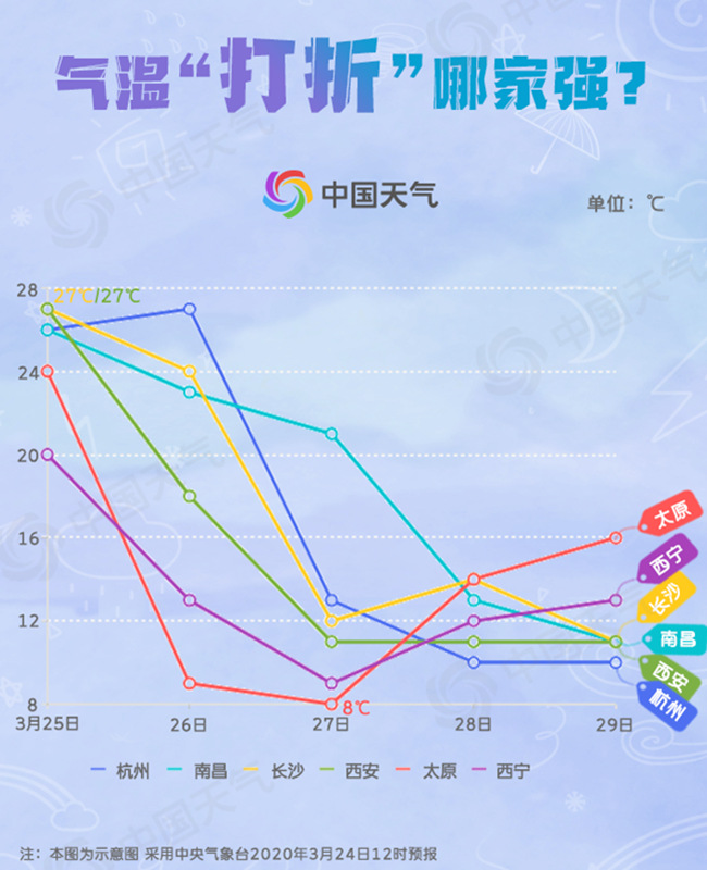 27日,南方大部也將加入降溫的行列,單日降溫幅度沒有北方劇烈,在6-8℃左右,但是累積降溫幅度大,27日開始的兩三天內,部分地區也將超過10℃。城市中,杭州最高氣溫累計降幅可達17℃、南昌降16℃、長沙降15℃、貴陽降14℃、上海降13℃,最高氣溫紛紛降至10℃出頭。29日,江淮、江漢和江南大部最低氣溫也僅有4~9℃。