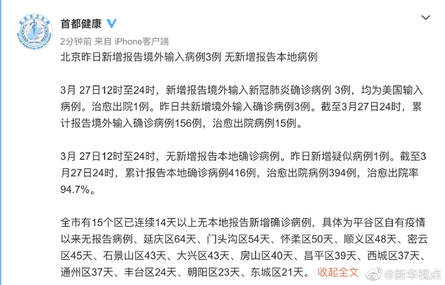 3月27日12時(shí)至24時(shí),新增報(bào)告境外輸入新冠肺炎確診病例3例,均為美國輸入病例。治愈出院1例。昨日共新增境外輸入確診病例3例。截至3月27日24時(shí),累計(jì)報(bào)告境外輸入確診病例156例,治愈出院病例15例。