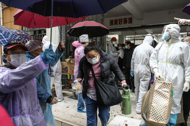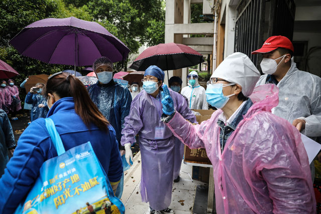 3月27日,武漢軟件工程職業學院康復驛站,冒雨離開的康復隔離觀察者。學校為每個康復人員送上了餐飲包,里面包含了牛奶、蛋黃派、蘋果等食物供路上吃。中青報·中青網記者 趙迪/攝