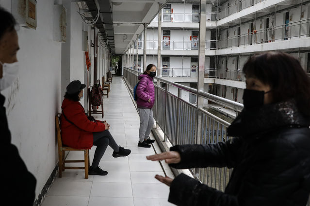3月27日,武漢軟件工程職業學院康復驛站,幾名結束康復隔離的觀察者在等待乘車離開。他們被送至集中樞紐點后,由社區派車接至家中。中青報·中青網記者 趙迪/攝
