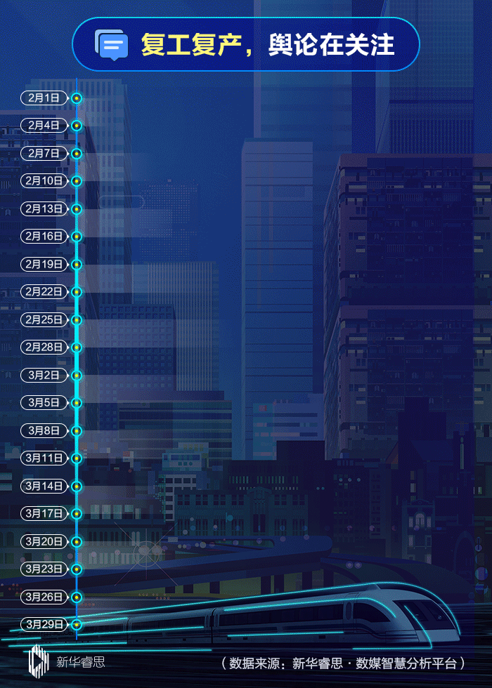對網(wǎng)上“復(fù)工復(fù)產(chǎn)”相關(guān)話題的信息量和關(guān)注熱度,新華睿思持續(xù)跟蹤,自2月初至3月28日統(tǒng)計(jì)總量已達(dá)2784萬條,網(wǎng)民的關(guān)注度不斷攀升。