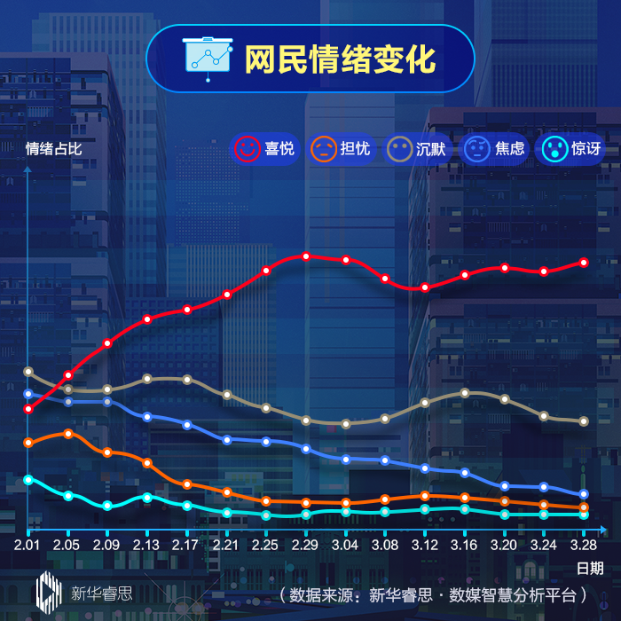 整體來看,喜悅情緒呈現(xiàn)快速上漲趨勢,擔(dān)憂、焦慮等情緒則在波動(dòng)下降。