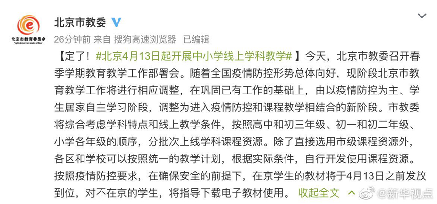 今天,北京市教委召開春季學期教育教學工作部署會。隨著全國疫情防控形勢總體向好,現階段北京市教育教學工作將進行相應調整,在鞏固已有工作的基礎上,由以疫情防控為主、學生居家自主學習階段,調整為進入疫情防控和課程教學相結合的新階段。市教委將綜合考慮學科特點和線上教學條件,按照高中和初三年級、初一和初二年級、小學各年級的順序,分批次上線學科課程資源。除了直接選用市級課程資源外,各區和學校可以按照統一的教學計劃,根據實際條件,自行開發使用課程資源。按照疫情防控要求,在確保安全的前提下,在京學生的教材將于4月13日之前發放到位,對不在京的學生,將指導下載電子教材使用。