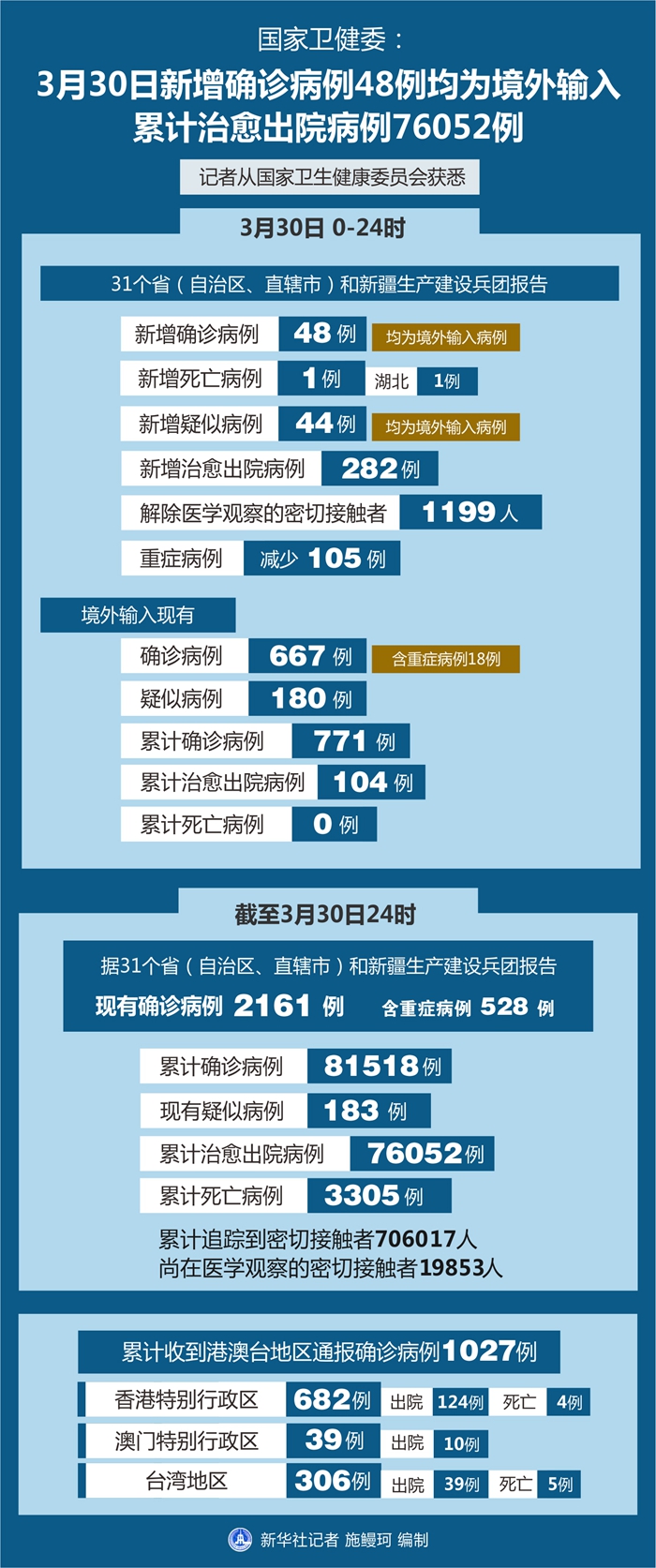 截至3月30日24時,據31個省(自治區、直轄市)和新疆生產建設兵團報告,現有確診病例2161例(含重癥病例528例),現有疑似病例183例。累計確診病例81518例,累計治愈出院病例76052例,累計死亡病例3305例,累計追蹤到密切接觸者706017人,尚在醫學觀察的密切接觸者19853人。