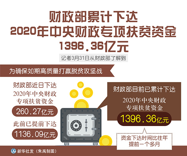 新華社北京3月31日電(記者申鋮)記者31日從財政部了解到,為確保如期高質量打贏脫貧攻堅戰,財政部目前已累計下達2020年中央財政專項扶貧資金1396.36億元,資金下達時間比往年提前一個多月。