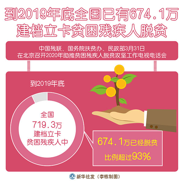 新華社北京3月31日電(記者孫少龍)中國殘聯(lián)、國務(wù)院扶貧辦、民政部31日在京召開2020年助推貧困殘疾人脫貧攻堅工作電視電話會。記者從會上了解到,到2019年底,全國719.3萬建檔立卡貧困殘疾人中,674.1萬已經(jīng)脫貧,比例超過93%。