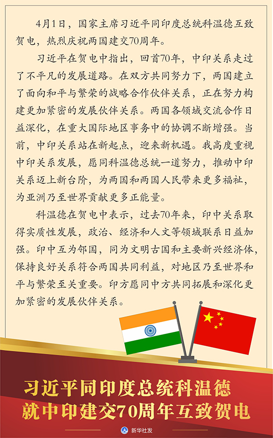 新華社北京4月1日電 4月1日,國家主席習近平同印度總統科溫德互致賀電,熱烈慶祝兩國建交70周年。