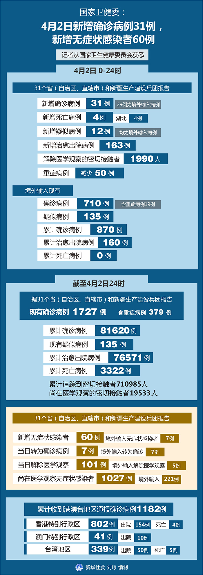 新華社北京4月3日電(記者樊曦、張泉)記者3日從國家衛生健康委員會了解到,4月2日0—24時,31個省(自治區、直轄市)和新疆生產建設兵團報告新增確診病例31例,其中29例為境外輸入病例,2例為本土病例(遼寧1例,廣東1例);新增死亡病例4例(湖北4例);新增疑似病例12例,均為境外輸入病例。