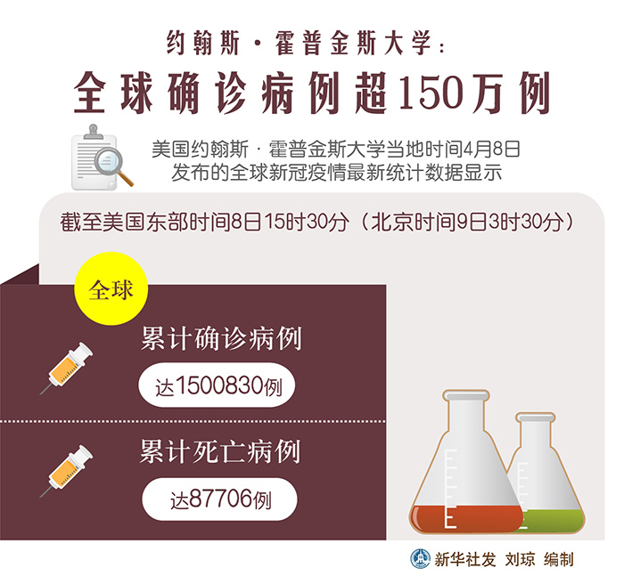 新華社紐約4月8日電? 美國約翰斯·霍普金斯大學(xué)8日發(fā)布的新冠疫情最新統(tǒng)計數(shù)據(jù)顯示,全球確診病例累計超過150萬例。