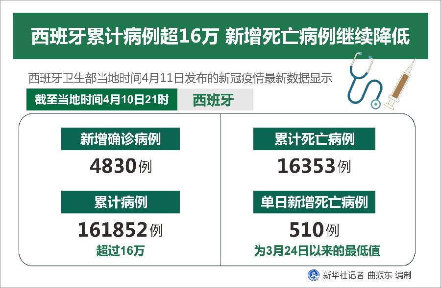 新華社馬德里4月11日電(謝宇智)西班牙衛生部11日發布的新冠疫情最新數據顯示,截至當地時間10日21時,西班牙新增確診病例4830例,累計病例數超過16萬,達到161852例;累計死亡病例達16353例,單日新增死亡病例510例,為3月24日以來的最低值。