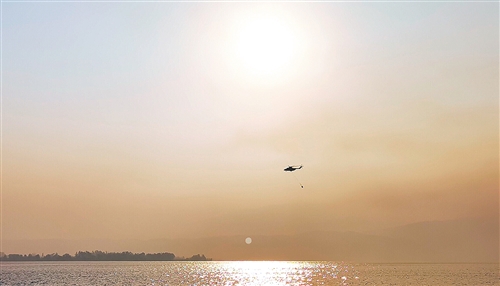 為撲救四川西昌森林火災(zāi),救援直升機在西昌邛海取水。 新華社發(fā)