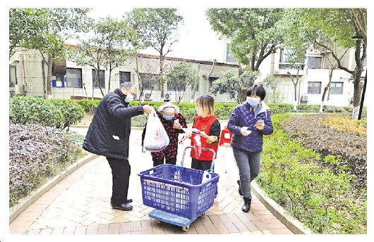 丁倩(左三)為社區老年人發放生活物資。