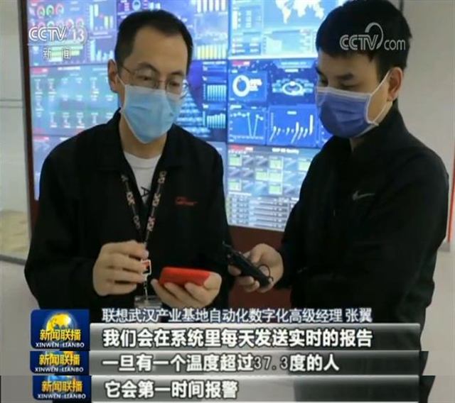 這里是聯(lián)想武漢產(chǎn)業(yè)基地,目前復(fù)工復(fù)產(chǎn)率已達到100%,所有返崗員工都需持有健康證明,在工作區(qū)域每隔4小時就有網(wǎng)格員來測量體溫。此外,企業(yè)還專門開發(fā)了數(shù)字化防疫系統(tǒng),對在崗員工健康狀況進行精準(zhǔn)管理。