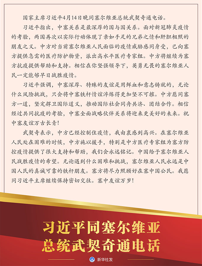 習近平指出,中塞關系是最深厚的國與國關系。面對新冠肺炎疫情的考驗,兩國再次以實際行動體現了親如手足的兄弟之情和肝膽相照的朋友之義。中方對當前塞爾維亞人民面臨的疫情威脅感同身受,已向塞方提供急需的醫療防護物資,派出高水平醫療專家組。中方將繼續為塞方抗疫提供幫助和支持。相信在你堅強領導下,英勇無畏的塞爾維亞人民一定能夠早日戰勝疫情。
