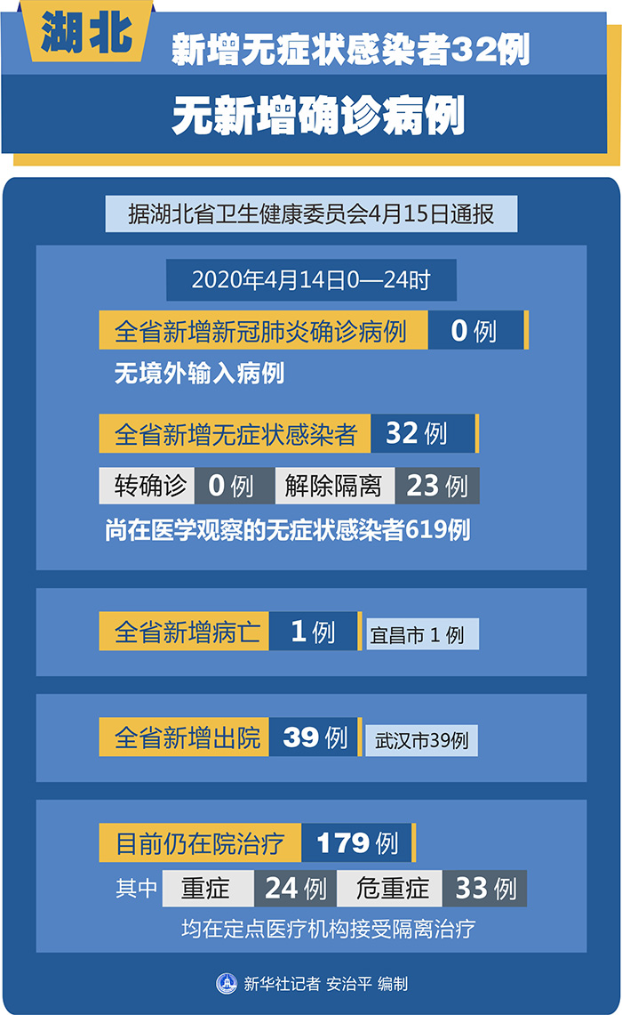 新華社武漢4月15日電(記者李偉、王作葵)據(jù)湖北省衛(wèi)生健康委員會(huì)15日通報(bào),2020年4月14日0—24時(shí),全省新增新冠肺炎確診病例0例,無境外輸入病例。全省新增無癥狀感染者32例,轉(zhuǎn)確診0例,解除隔離23例,尚在醫(yī)學(xué)觀察的無癥狀感染者619例。