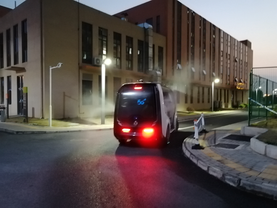 據悉,以Sharing-VAN無人駕駛觀光車為基礎平臺,臨時抗疫服務小組對車輛進行了自動駕駛、5G云控等方面的優化改裝,同時加裝16L大容量全自動消毒噴霧器,以實現觀察區內高危道路的全程無人駕駛消毒作業。