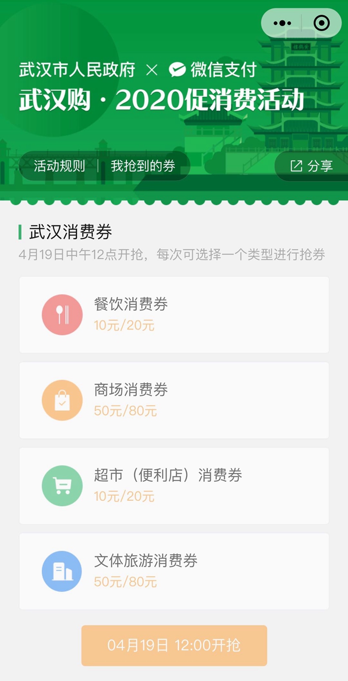 根據安排,“武漢消費券”將在阿里巴巴、美團點評、騰訊等3家企業自有線上平臺上按周投放,總體投放分兩期執行。其中,第一期為4月19日至5月31日,首次投放活動將在4月19日中午12時進行,在漢人員可登錄支付寶、美團、大眾點評、微信等手機程序,搜索“武漢”“消費券”等關鍵詞進入活動頁面參與領券。第二期為6月1日至7月31日,具體投放時間另行公布。