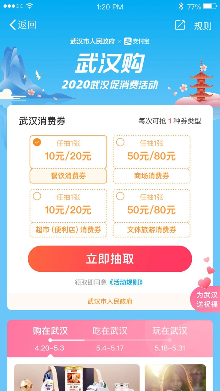 首期“武漢消費券”根據不同消費種類設置不同面額,其中,餐飲消費券和超市(便利店)消費券包含10元和20元兩種面額,商場消費券和文體旅游消費券包含50元和80元兩種面額。在漢人員每人每月在同一企業所屬平臺上領取的“武漢消費券”累計核銷總額不得超過100元,整個活動(兩期內)累計核銷總額不超過200元,3個平臺累計核銷總額不超過600元。
