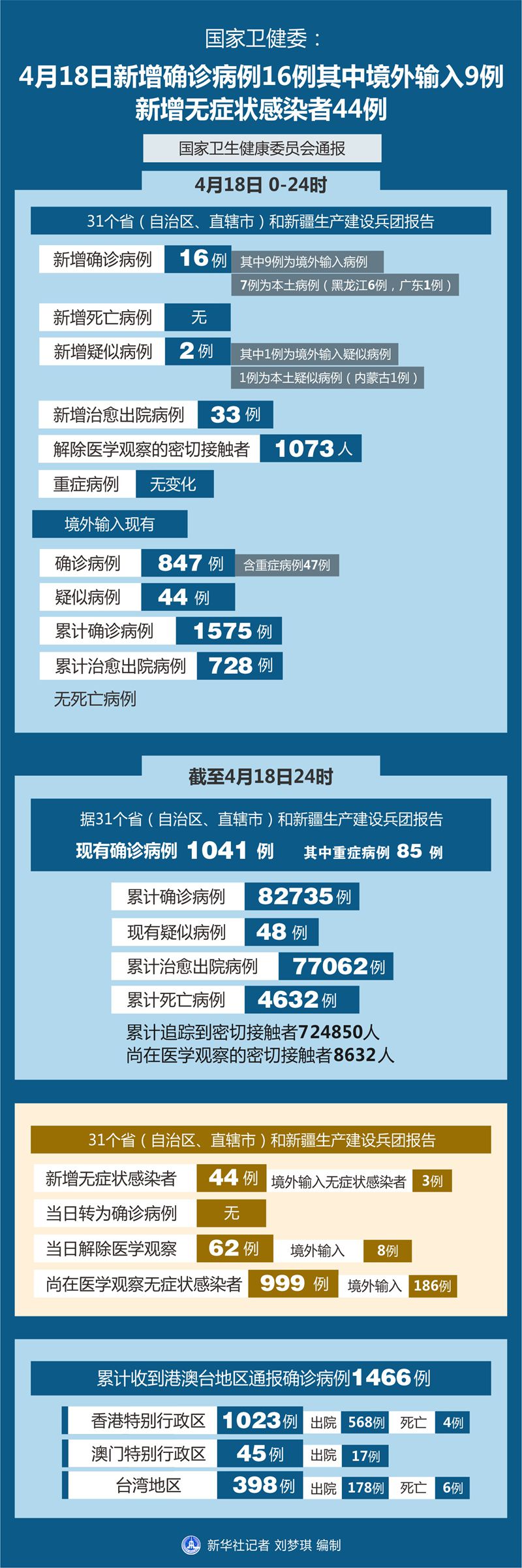 截至4月18日24時,據31個省(自治區、直轄市)和新疆生產建設兵團報告,現有確診病例1041例(其中重癥病例85例),累計治愈出院病例77062例,累計死亡病例4632例,累計報告確診病例82735例,現有疑似病例48例。累計追蹤到密切接觸者724850人,尚在醫學觀察的密切接觸者8632人。