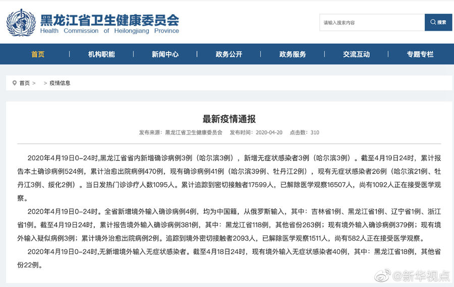 2020年4月19日0-24時,黑龍江省省內新增確診病例3例(哈爾濱3例),新增無癥狀感染者3例(哈爾濱3例)。截至4月19日24時,累計報告本土確診病例524例,累計治愈出院病例470例,現有確診病例41例(哈爾濱39例、牡丹江2例),現有無癥狀感染者26例(哈爾濱21例、牡丹江3例、綏化2例)。當日發熱門診診療人數1095人。累計追蹤到密切接觸者17599人,已解除醫學觀察16507人,尚有1092人正在接受醫學觀察。