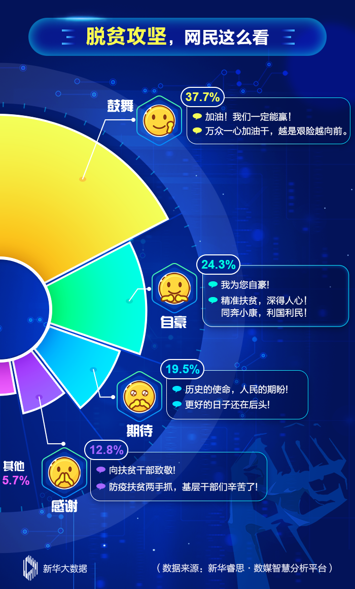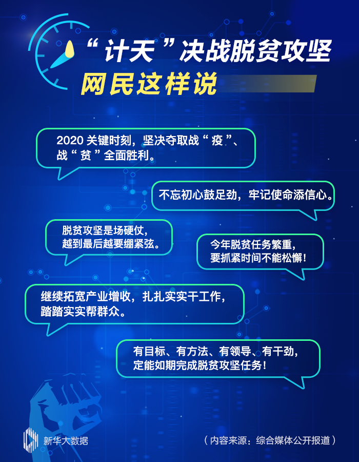 數據顯示,倒計時沖鋒之際,網民對脫貧攻堅非常關注。有網民留言稱:今年脫貧任務繁重,要抓緊時間不能松懈;也有網民留言表示要扎扎實實干工作;還有網民留言表達對完成目標任務的信心:2020關鍵時刻,堅決奪取戰“疫”、戰“貧”全面勝利。