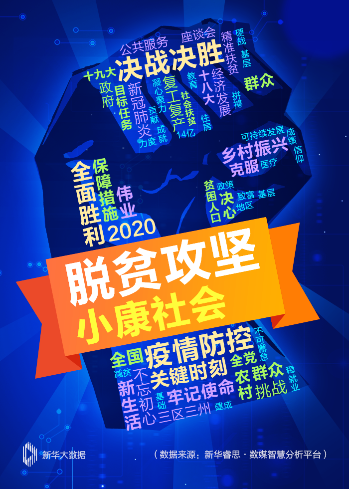總書記的牽掛,也是網民的關注。新華睿思持續跟蹤微博、抖音、今日頭條等網上熱搜榜高熱話題,以及重大新聞事件,梳理出網民關注的熱詞集錦。根據關注度排行可以看出,“脫貧攻堅”“小康社會”兩大關鍵詞位居前列,“決戰決勝”“全面勝利”“疫情防控”等也成為熱搜詞匯。